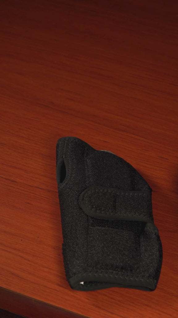 Férula para muñeca en neopreno, con barra palmar y 3 cierres de velcro, bordes ribeteados, y reversible, con barra estabilizadora.